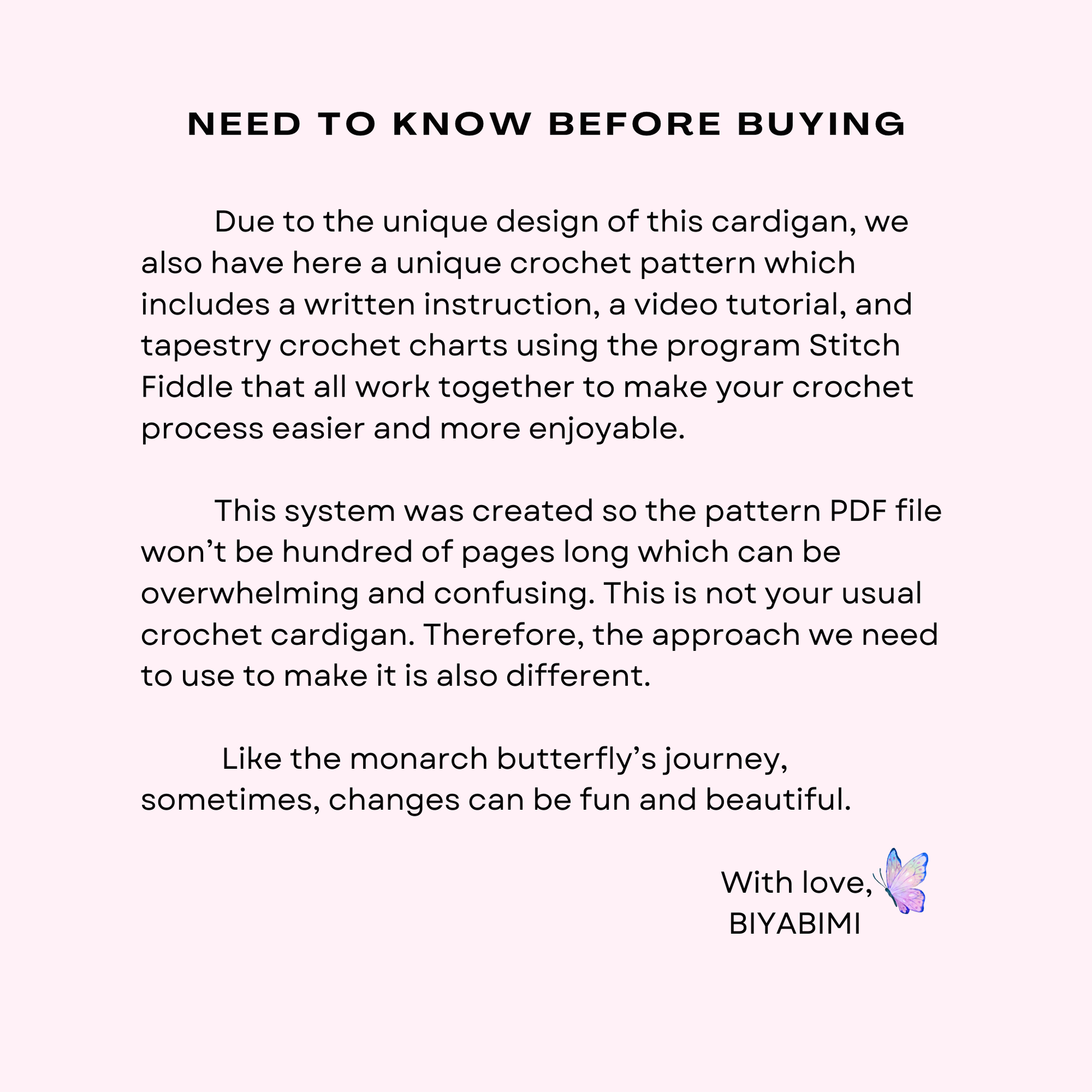 🦋 With this unique cardigan design, its crochet pattern and approach are also different than your usual cardigan crochet pattern. Please be sure you're open to trying new things before purchasing.