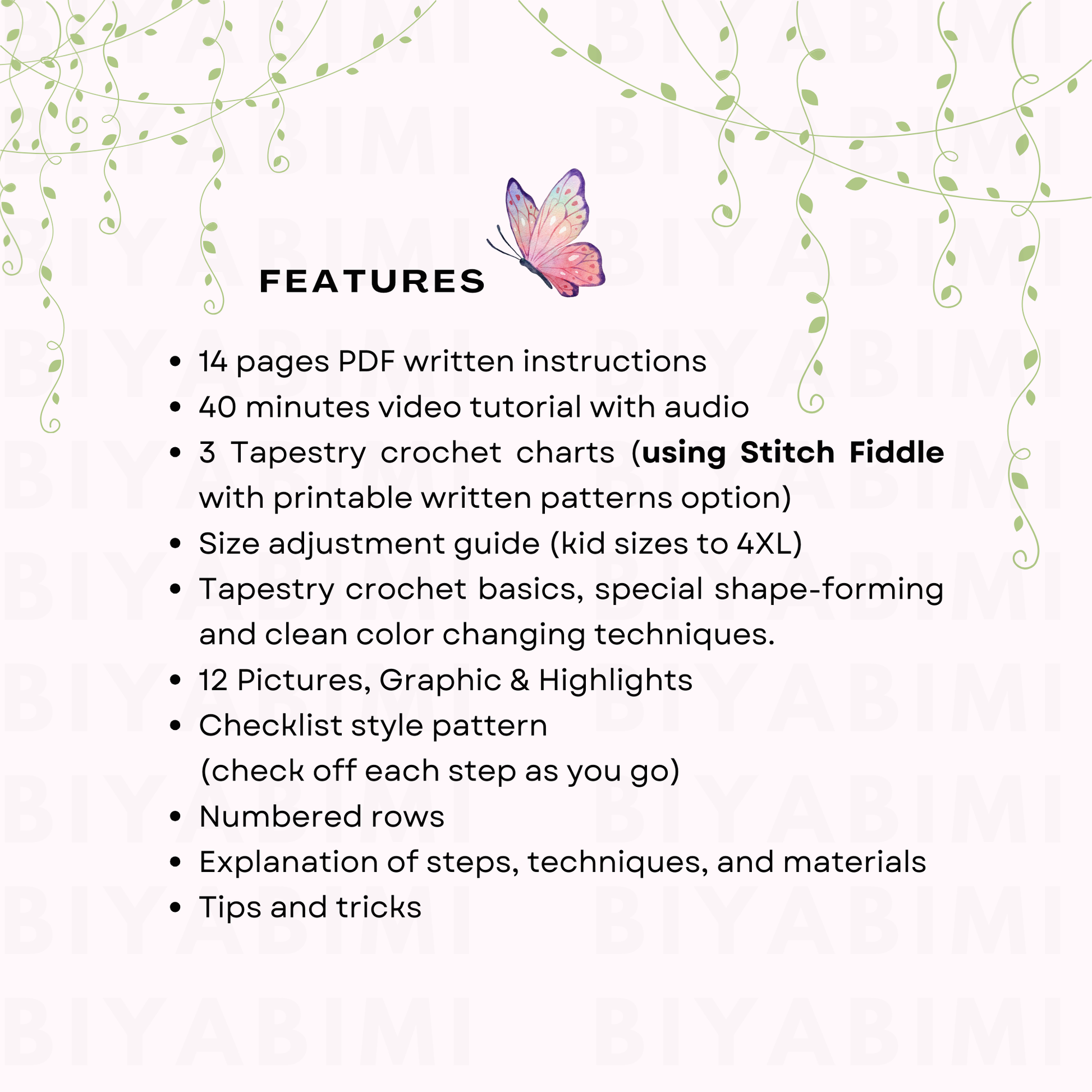 🦋 Digital PDF pattern (14 pages) including crochet instructions, a 40-minute accompanying video tutorial, and 3 tapestry crochet charts links will be sent directly to your email immediately. This is a digital download through your email. Nothing will be mailed to you.